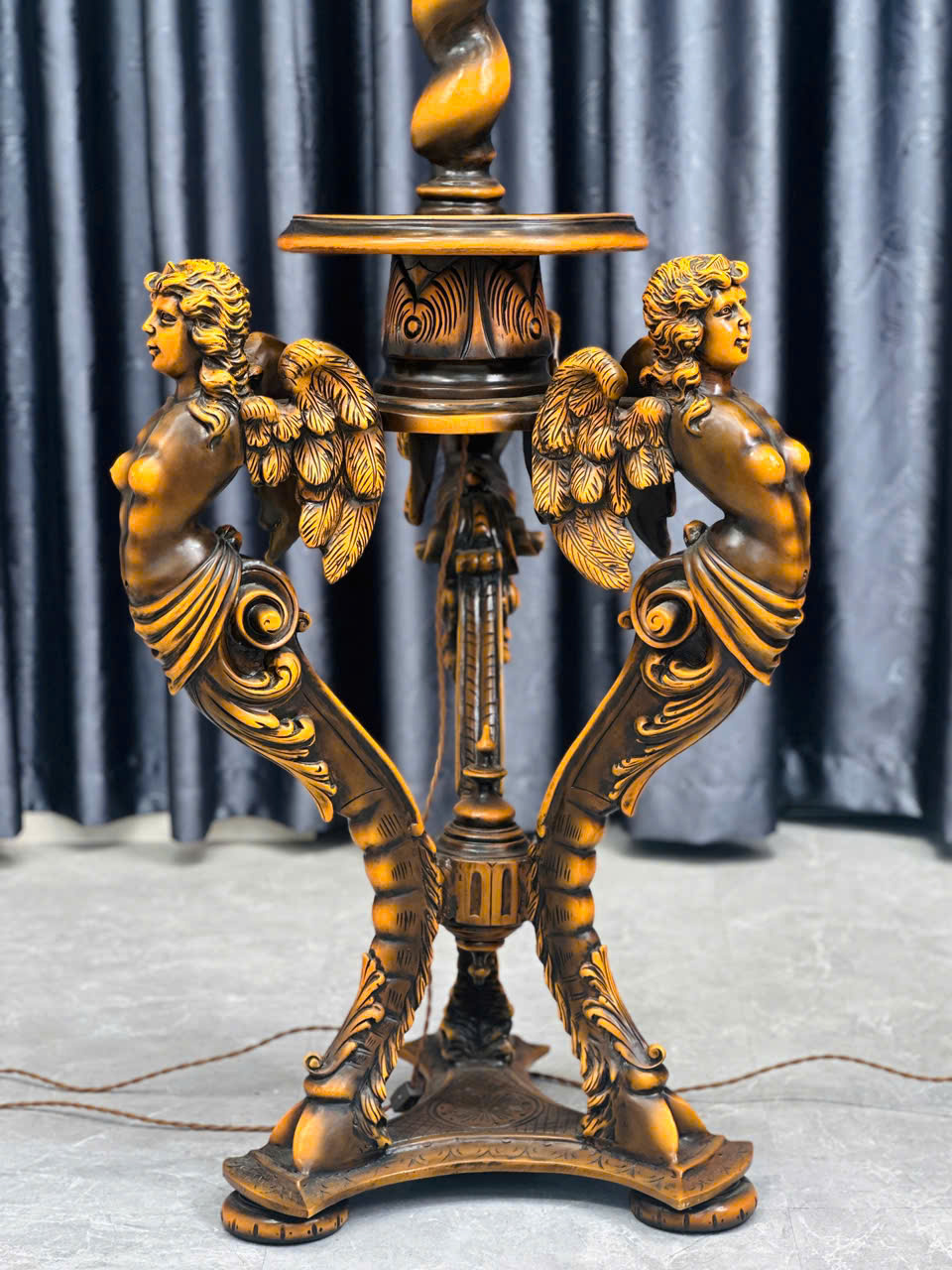 Các chi tiết trên thân đèn như nếp áo, đường cong cơ thể, cánh thiên thần, hoa văn chân đế đều được hoàn thiện tỉ mỉ, sắc nét, thể hiện tay nghề của nghệ nhân và tiêu chuẩn chế tác cao cấp. Nếp áo được tạo hình với độ rủ tự nhiên, có sự chuyển tiếp mềm mại giữa các mảng sáng – tối, mô phỏng kỹ thuật xử lý drapery trong điêu khắc cổ điển. Đường cong cơ thể thiên thần được xây dựng theo tỷ lệ giải phẫu học lý tưởng hóa, nhấn mạnh vẻ đẹp hài hòa, thanh thoát, không quá hiện thực nhưng vẫn đủ độ sống động.
