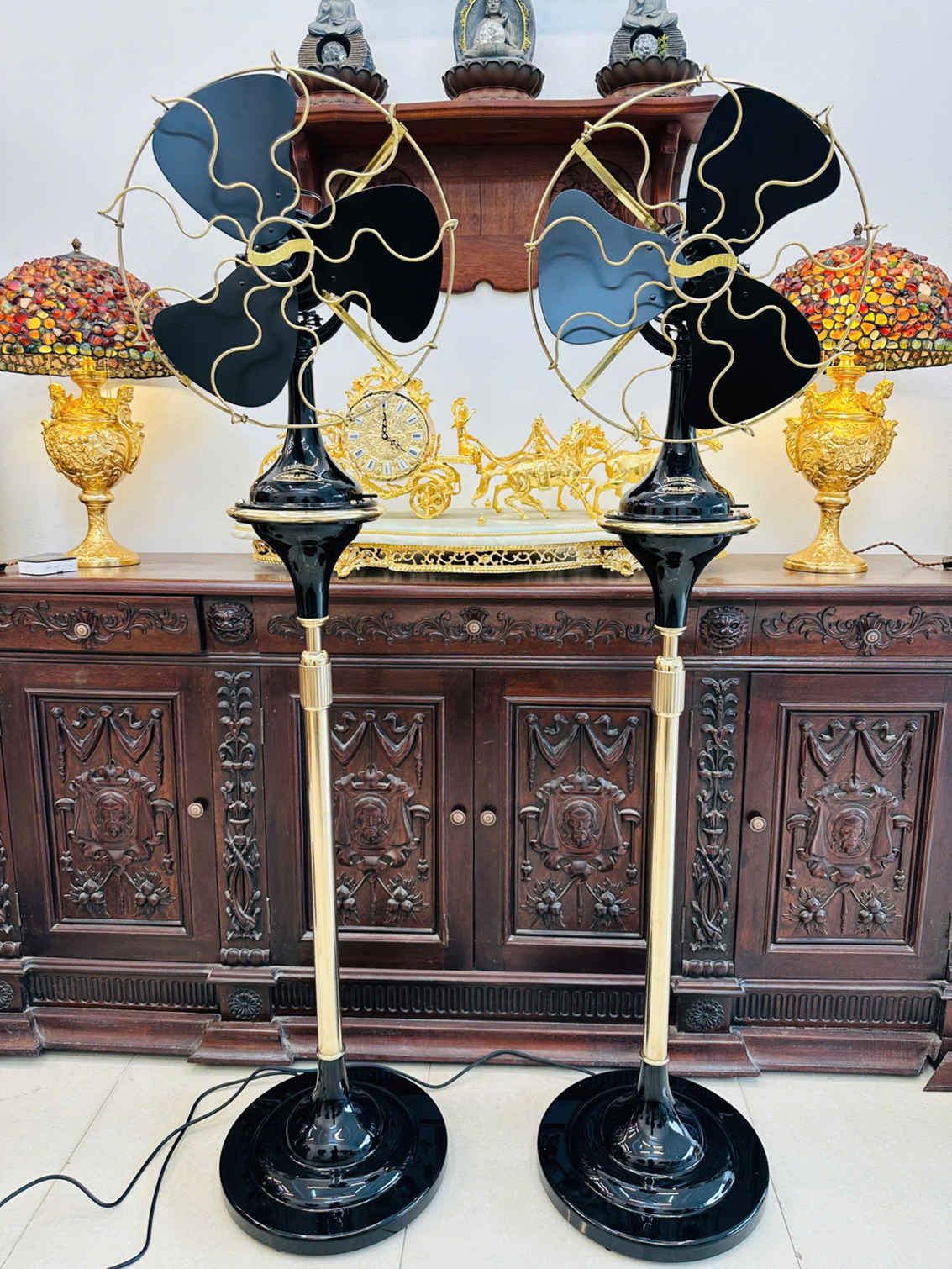 Ở góc độ hình thái và tỷ lệ, cấu hình quạt cây chiều cao tổng khoảng 2m, hạ thấp 1m6, cánh 40cm, lồng 45cm, toàn thân gang đồng, được xem là “tỷ lệ vàng” cho cả trưng bày lẫn sử dụng. Chiều cao 2m giúp quạt có trục gió cao, phù hợp không gian trần lớn, phòng khách, sảnh, quán cà phê phong cách retro; khi hạ thấp 1m6 lại vừa tầm sử dụng trong gia đình. Đường kính cánh 40cm kết hợp lồng 45cm tạo lưu lượng gió sâu, dày, không bị tản nhanh như nhiều quạt cánh nhỏ. Thân gang đồng đúc dày tạo độ đầm, giảm rung, đồng thời mang lại cảm giác “công nghiệp nặng” rất đặc trưng, khác hẳn thân nhựa hoặc tôn mỏng của quạt đời sau.